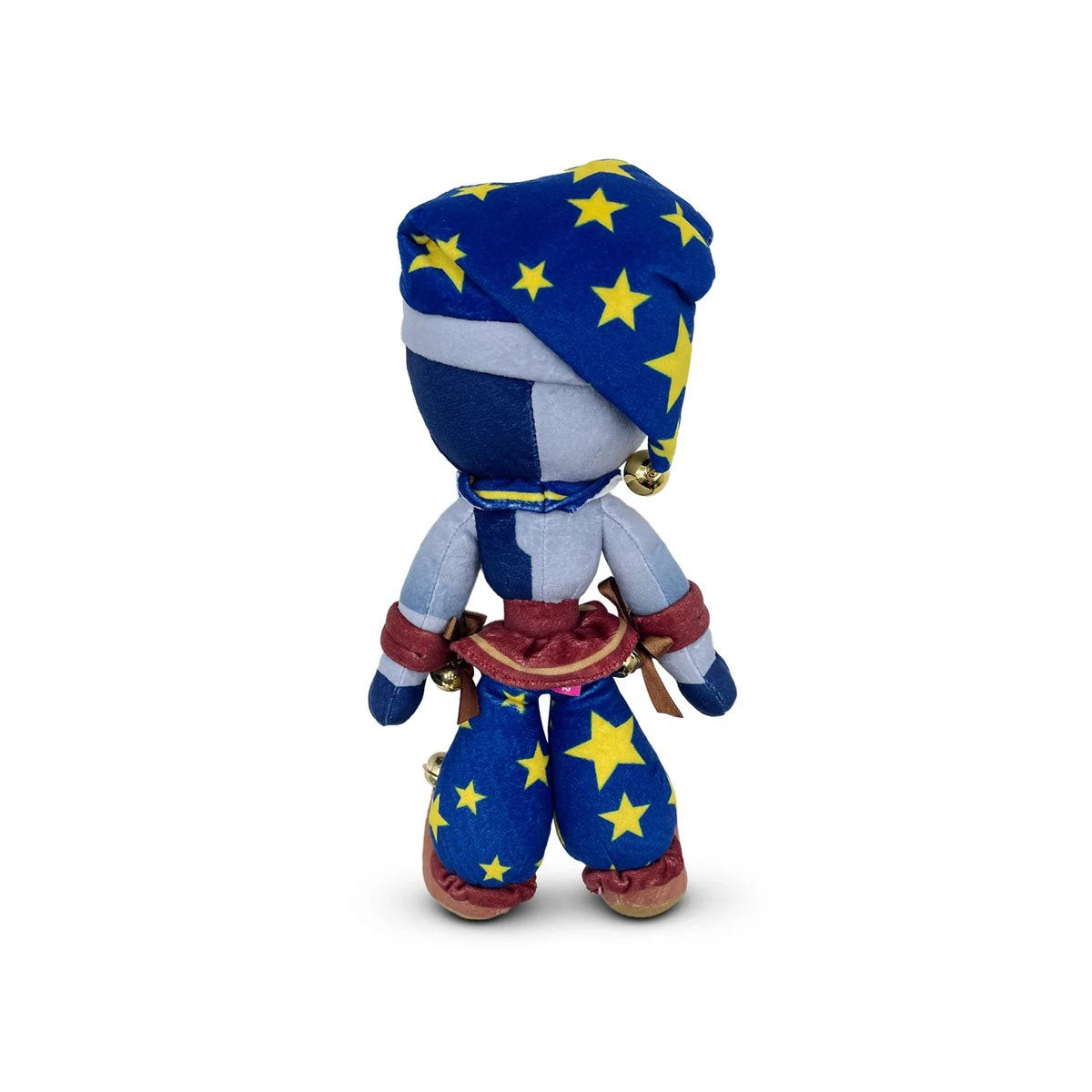 Moon makes their returns to Youtooz to make sure you're obeying the rules! Standing at 9-inches tall with bright red eyes and a cheeky curling smile creeping up over a two tone grey and blue face. Their long star patterned hat dangles down to the side and ends in a golden bell that matches the two that are attached to their wrists, which lay out by their sides. With a frilled blue and yellow neck piece and ruffled brown waist, their puffy blue pants expand at the end and are finished with curling brown shoes. This plush is packed to the seams with 100% PP cotton and made of a mixture of normal and sublimated minky materials, absolutely perfect for cuddling or and making sure you keep the lights on!